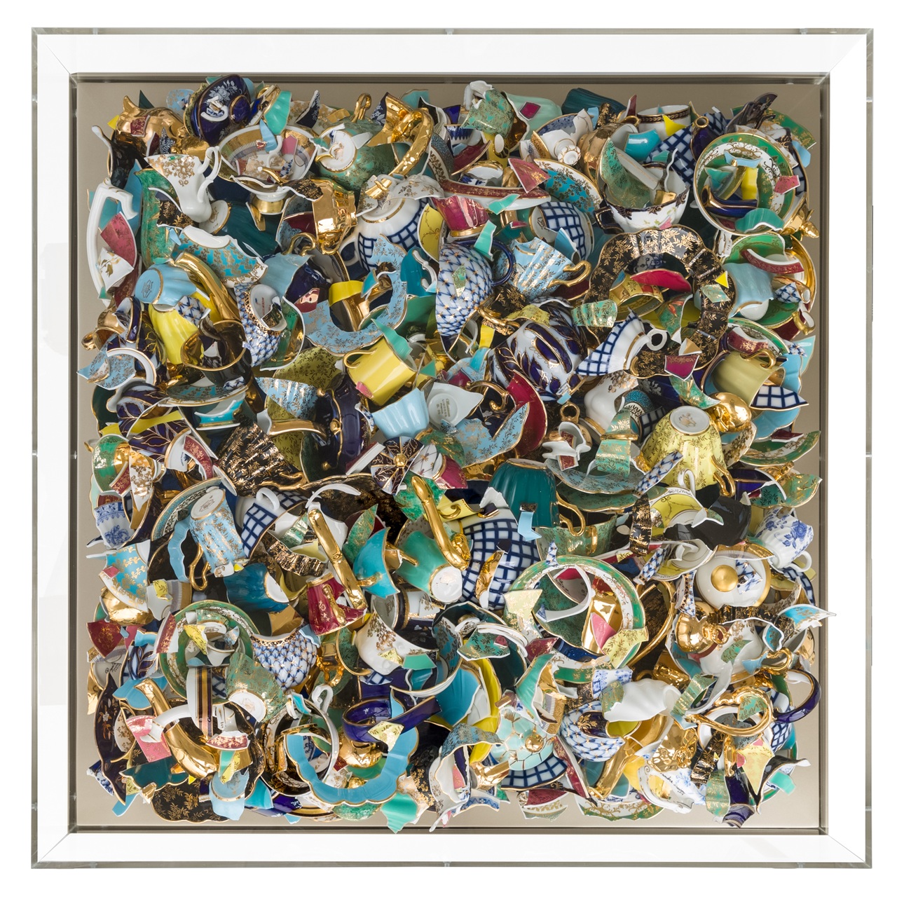 100x100x25Dcm | Royal Stuart Stevenson, Limoges and Russian Lomonosov Vintage Fine Bone Porcelain. Jesmonite, Acrylic Paint, Aluminium Panel and Perspex Box | 2019