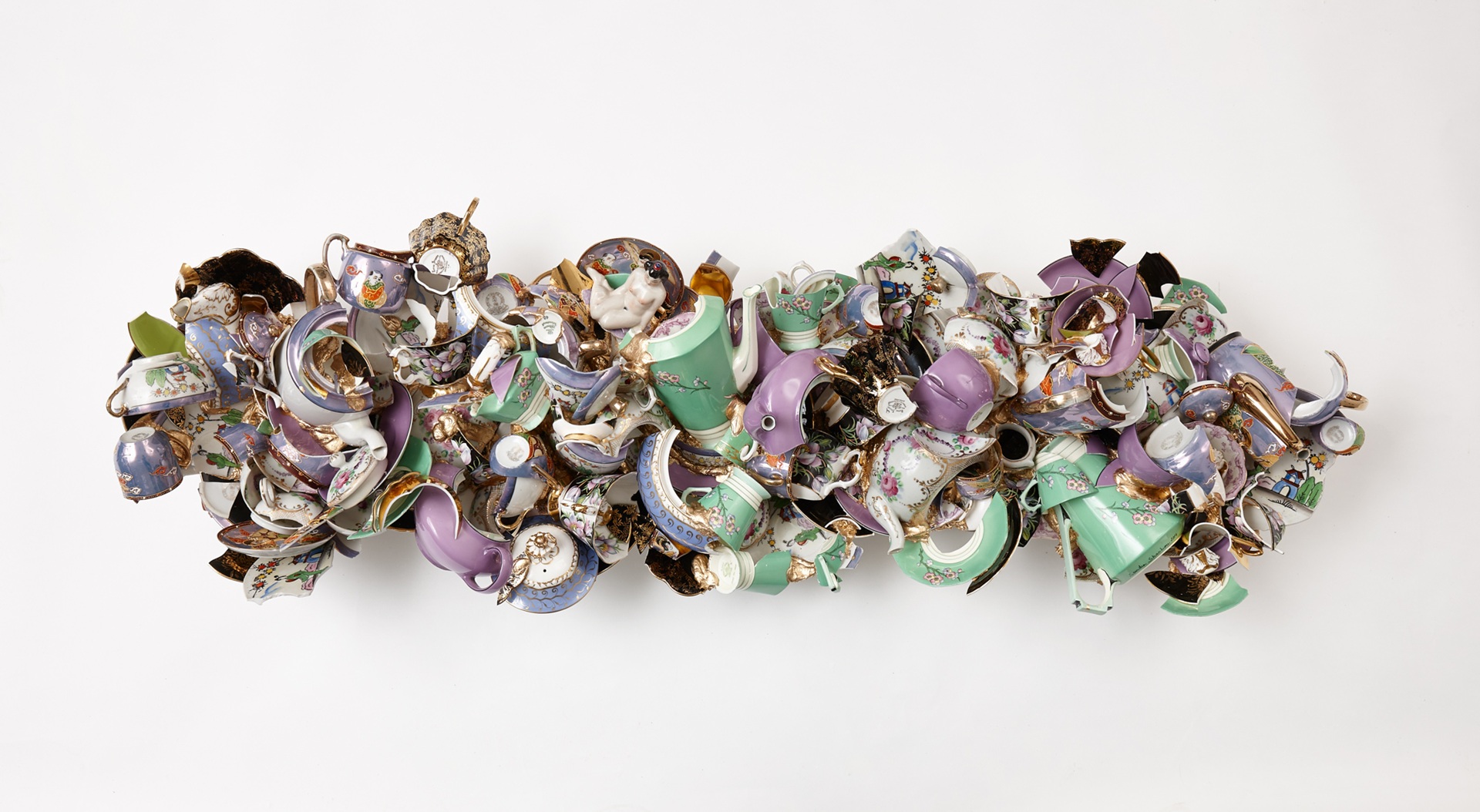 Sandra Shashou’s new body of work, comprising of arrangements of smashed fragments of bone china tea sets, oscillates between modalities of dissolution and reformulation, order and rupture, and historical eras.