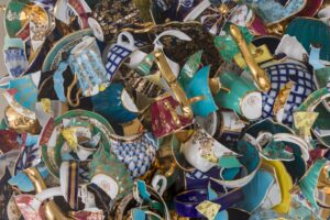 Sandra Shashou’s new body of work, comprising of arrangements of smashed fragments of bone china tea sets, oscillates between modalities of dissolution and reformulation, order and rupture, and historical eras.