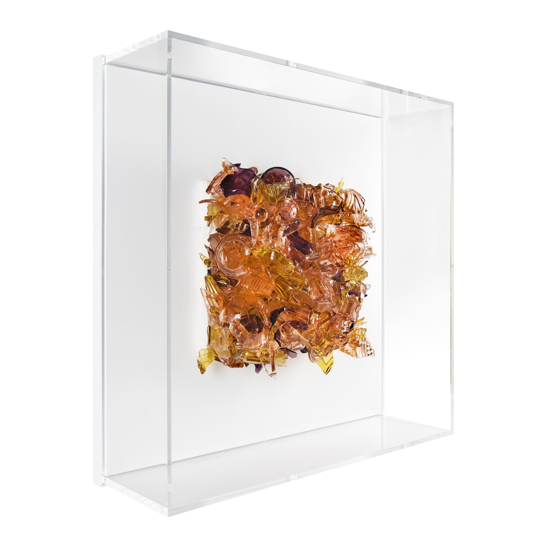 Shashou brings these tea sets back to her studio and using a small hammer she shatters, punctures, chips and fragments. And yet the shapes of the original crockery are somehow preserved and repurposed in her intricate constructions. The curves of the broken tea sets undulate across simple rectangular surfaces, or swirl around rotundas with a baroque flamboyance. In some the pieces lock tightly together as if part of some giant Cubist puzzle, in other shards seem to be caught in the freeze frame of a constructivist explosion. Her chromatically rich, harmonious works match crimsons, mustard yellows and pinks, or mauve, turquoise and blue. Set in a gold or white ground, Shashou’s fragments unfold like Jackson Pollock’s all-over paintings – only shattered, not splattered.