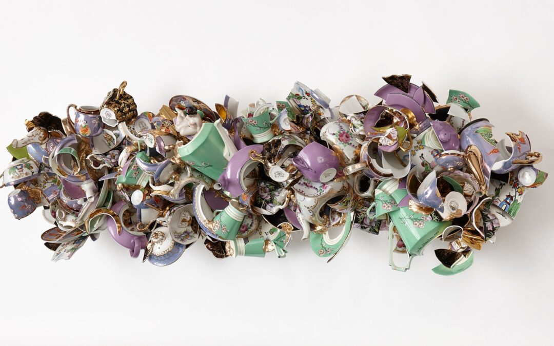 Sandra Shashou’s new body of work, comprising of arrangements of smashed fragments of bone china tea sets, oscillates between modalities of dissolution and reformulation, order and rupture, and historical eras.