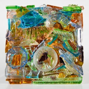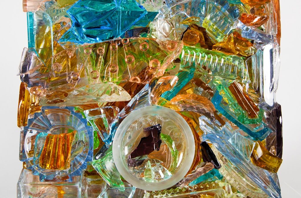 Shashou brings these tea sets back to her studio and using a small hammer she shatters, punctures, chips and fragments. And yet the shapes of the original crockery are somehow preserved and repurposed in her intricate constructions. The curves of the broken tea sets undulate across simple rectangular surfaces, or swirl around rotundas with a baroque flamboyance. In some the pieces lock tightly together as if part of some giant Cubist puzzle, in other shards seem to be caught in the freeze frame of a constructivist explosion. Her chromatically rich, harmonious works match crimsons, mustard yellows and pinks, or mauve, turquoise and blue. Set in a gold or white ground, Shashou’s fragments unfold like Jackson Pollock’s all-over paintings – only shattered, not splattered.