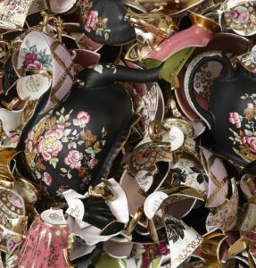 Her source material is the bone china produced by Europe’s finest porcelain manufacturers, as the titles of her works indicate – Hamilton, Argyle, Tuscan, Royal Albert, Wedgwood, Limoges, Meito hand-painted and Cobalt – and collected by her from dealers and flea markets. The designs range across centuries and topographies: in one work the lemons and blues of Art Deco, in another the crimson of Edwardian and Victorian designs, and in a third the blue tracery of Chinoiserie.