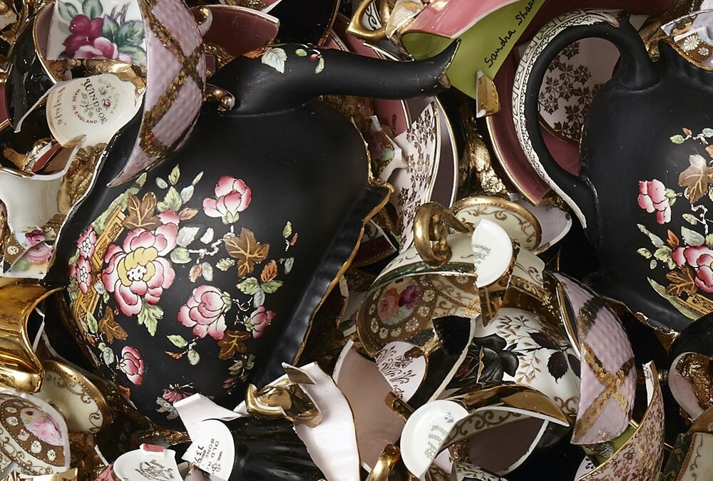 Sandra Shashou’s new body of work, comprising of arrangements of smashed fragments of bone china tea sets, oscillates between modalities of dissolution and reformulation, order and rupture, and historical eras.