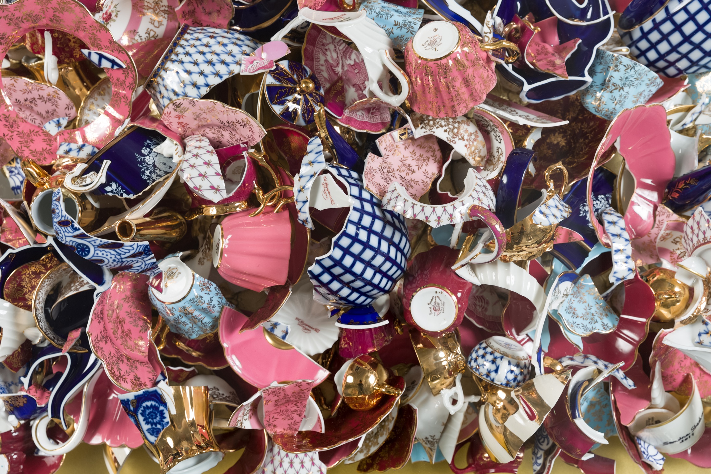 Sandra Shashou’s new body of work, comprising of arrangements of smashed fragments of bone china tea sets, oscillates between modalities of dissolution and reformulation, order and rupture, and historical eras.