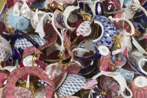 Sandra Shashou’s new body of work, comprising of arrangements of smashed fragments of bone china tea sets, oscillates between modalities of dissolution and reformulation, order and rupture, and historical eras.