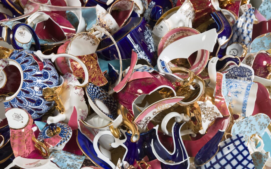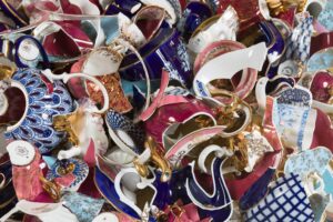 Sandra Shashou’s new body of work, comprising of arrangements of smashed fragments of bone china tea sets, oscillates between modalities of dissolution and reformulation, order and rupture, and historical eras.