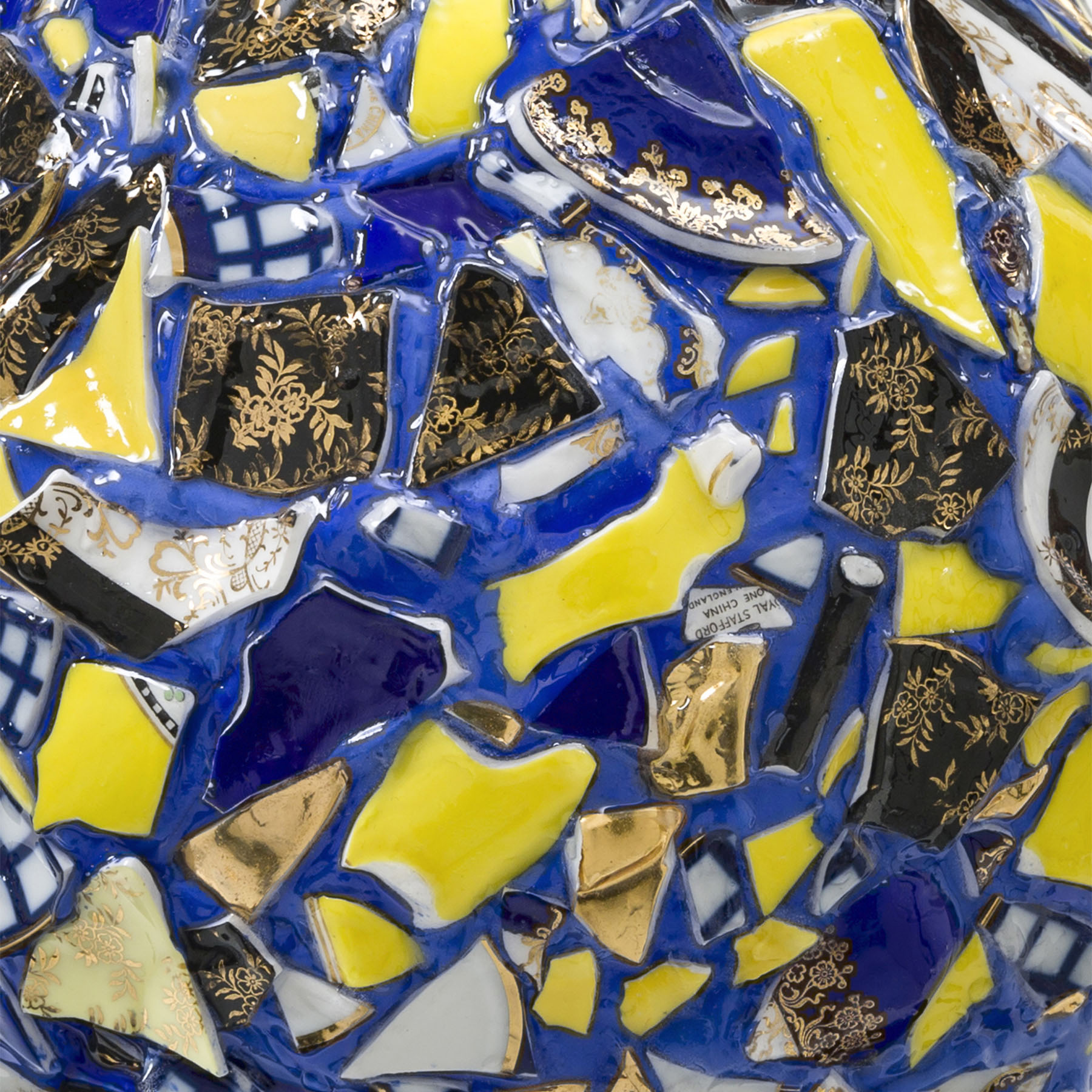 Shashou brings these tea sets back to her studio and using a small hammer she shatters, punctures, chips and fragments. And yet the shapes of the original crockery are somehow preserved and repurposed in her intricate constructions. The curves of the broken tea sets undulate across simple rectangular surfaces, or swirl around rotundas with a baroque flamboyance. In some the pieces lock tightly together as if part of some giant Cubist puzzle, in other shards seem to be caught in the freeze frame of a constructivist explosion. Her chromatically rich, harmonious works match crimsons, mustard yellows and pinks, or mauve, turquoise and blue. Set in a gold or white ground, Shashou’s fragments unfold like Jackson Pollock’s all-over paintings – only shattered, not splattered.