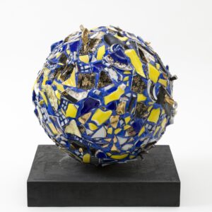 Shashou brings these tea sets back to her studio and using a small hammer she shatters, punctures, chips and fragments. And yet the shapes of the original crockery are somehow preserved and repurposed in her intricate constructions. The curves of the broken tea sets undulate across simple rectangular surfaces, or swirl around rotundas with a baroque flamboyance. In some the pieces lock tightly together as if part of some giant Cubist puzzle, in other shards seem to be caught in the freeze frame of a constructivist explosion. Her chromatically rich, harmonious works match crimsons, mustard yellows and pinks, or mauve, turquoise and blue. Set in a gold or white ground, Shashou’s fragments unfold like Jackson Pollock’s all-over paintings – only shattered, not splattered.