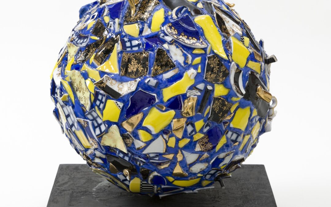 Her source material is the bone china produced by Europe’s finest porcelain manufacturers, as the titles of her works indicate – Hamilton, Argyle, Tuscan, Royal Albert, Wedgwood, Limoges, Meito hand-painted and Cobalt – and collected by her from dealers and flea markets. The designs range across centuries and topographies: in one work the lemons and blues of Art Deco, in another the crimson of Edwardian and Victorian designs, and in a third the blue tracery of Chinoiserie.